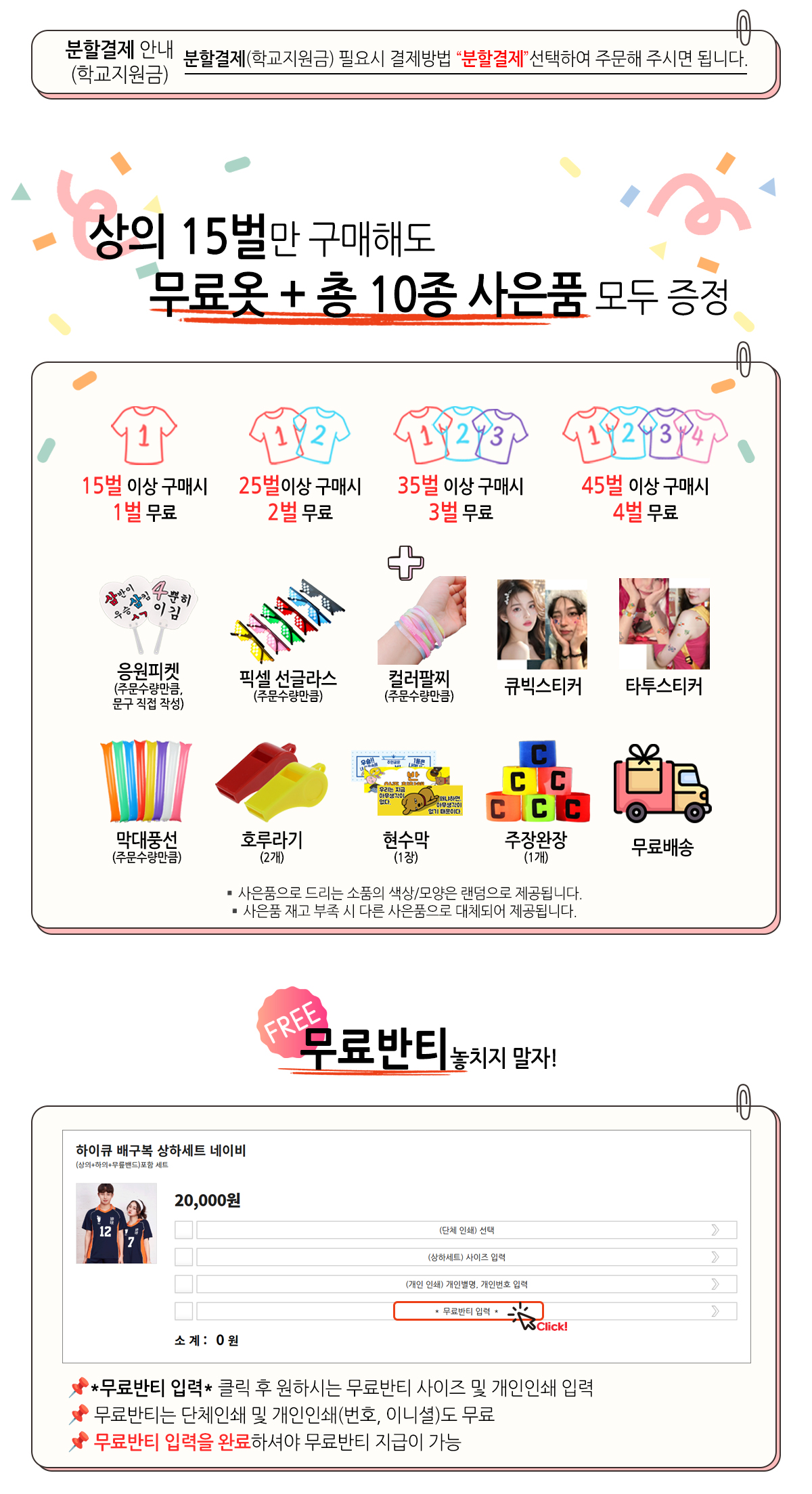 긴팔,반팔(필수선택) / 하의, 등이름, 개인번호 추가